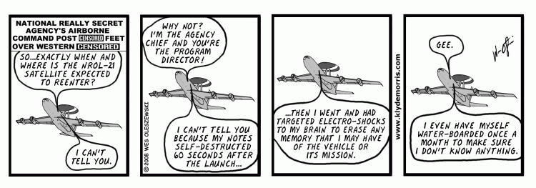 Как сообщает Associated Press, главком северного командования США и командования воздушно-космической обороны Северо-Американского континента НОРАД генерал ВВС США Джин Ренуарт (Gene Renuart) официально признал факт скорого неуправляемого схода с орбиты секретного разведывательного спутника Пентагона.