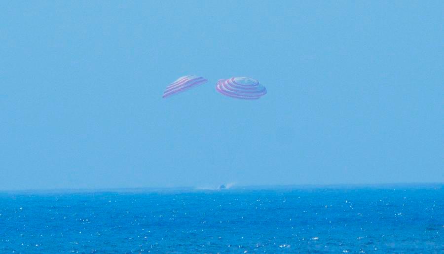 11 февраля 2026 года, возвращаемый модуль китайского пилотируемого космического корабля нового поколения "Мэнчжоу" в рамках программного управления благополучно приводнился в заданном морском районе в ходе летного испытания. /Фото: Синьхуа/