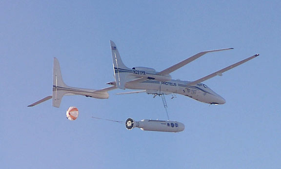The three drop tests, carried out by t/Space and its partner, Scaled Composites between May 24 and June 14, involved a 23-percent scale model of the booster, carried aloft and then released from underneath Scaled's Proteus aircraft.