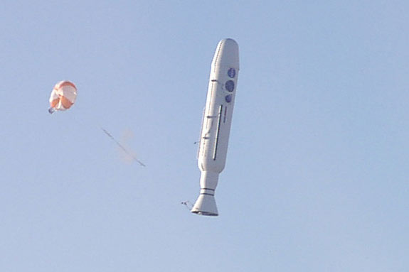The innovation developed by t/Space is a special mechanism that holds on to the nose of the booster for about a half-second after the center of the rocket is released. This slight tug on the nose starts the booster rotating as it drops. A small parachute on the rocket's nozzle ensures the rotation happens slowly.