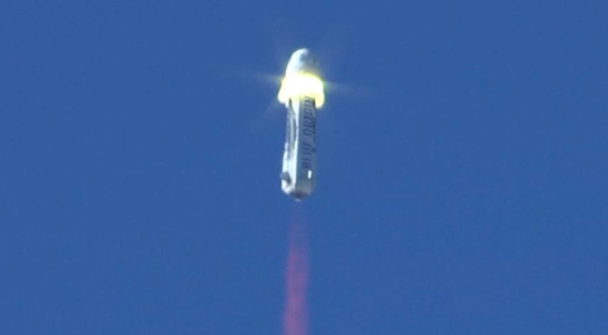 The New Shepard crew capsule ignites its abort motor to separate from its propulsion module on an Oct. 5 in-flight test of the vehicle's abort system. Credit: Blue Origin