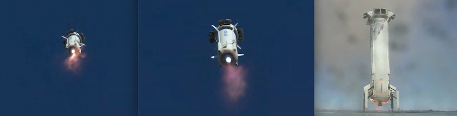 The New Shepard's BE-3 engine fires to slow down for landing. Credit: Blue Origin