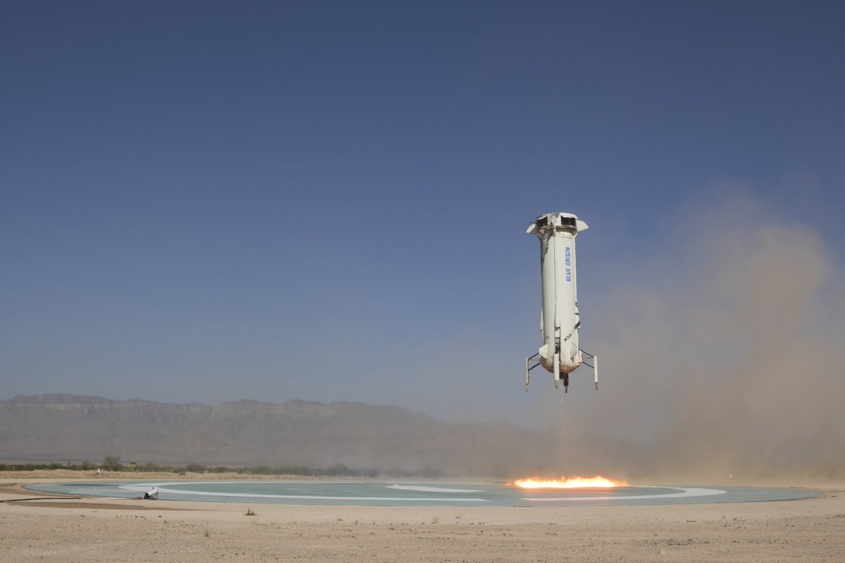 The booster deployed air brakes to slow its descent, then reignited the BE-3 engine and extended landing legs to touch down on a landing pad around 2 miles (3 kilometers) from its launch location at the sprawling West Texas test site owned by Bezos.