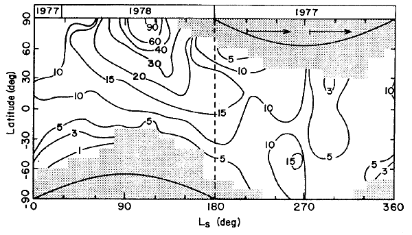 Сезонная эволюция атмосферной воды на Марсе по данным эксперимента MAWD. Указаны микроны осажденной воды в столбе. Афелий соответствует солнечной долготе Ls = 70° . [/size]