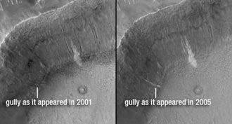 Цитировать....Eroded gullies on crater walls and cliff sides were first observed in images taken by the Mars Global Surveyor. Most of the models to describe these formations had water coming out of the ground in aquifers and springs, or had ice-impregnated soils melting during warmer climatic periods and causing landslides.