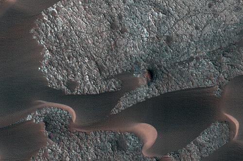 This HiRISE image is part of a series in search for a safe place the Mars Science Laboratory rover can land. In the central part of the image, the terrain is a mix of sand dunes and relatively smooth rock exposures. There are some small knobs but very few large rocks in the area. Instead, the multi-colored rock exposures seem to be mostly a mosaic of flat fractured rock.