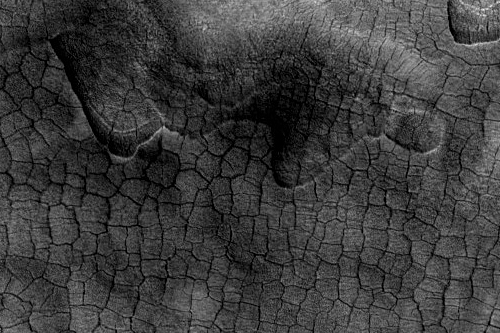 подобие такой структуры на Земле:. Это  полигональный рельеф в пойме реки Яна на севере Якутии, в приполярной области. В центре — булгуннях (вздутие, горка). Аэрофотоснимок. Ссылка на работу - http://geo.1september.ru/article.php?ID=200102705.