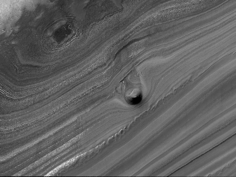 ....image of a mound within the area of a trough cutting into Mars' north polar layered deposits was taken by the High Resolution Imaging Science Experiment (HiRISE) camera on NASA's Mars Reconnaissance Orbiter on Sept. 2, 2008....