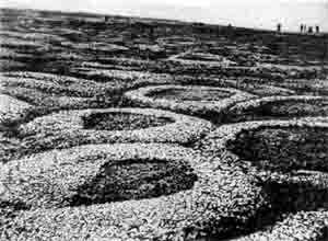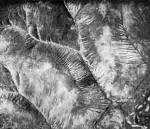 Если снега мало или его вообще сдуло ветром, температура мерзлой породы понижается очень сильно, заметно уменьшается ее объем и образуются морозобойные трещины, уходящие вниз в несколько раз глубже, чем мерзлая порода может оттаять летом. Весной эти трещины заполняются водой, осенью вода замерзает и расширяет трещины, в которых постепенно образуются ледяные клинья, причем сами эти клинья с поверхности не видны. Но грунт, постепенно накапливающийся на таких клиньях, имеет совершенно другой режим увлажнения, чем между ними, поэтому полосы вдоль трещин хорошо выделяются по растительности и потому хорошо видны на аэрофотоснимках (рис. 51). Многоугольники (полигоны), ограниченные трещинами, имеют в поперечнике от одного двух десятков до нескольких сотен метров. В зависимости от состава грунтов, температурного режима полосы вдоль морозобойных трещин могут возвышаться над уровнем полигонов или быть ниже их.