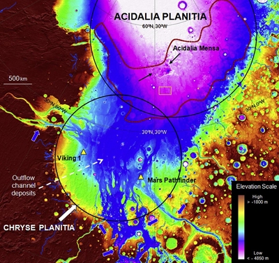 ЦитироватьAfter mapping more than 18,000 mud-volcano-like structures in Acidalia Planitia located in the northern plains of Mars, Oehler and Allen believe it is one of the best places to search for traces of life.