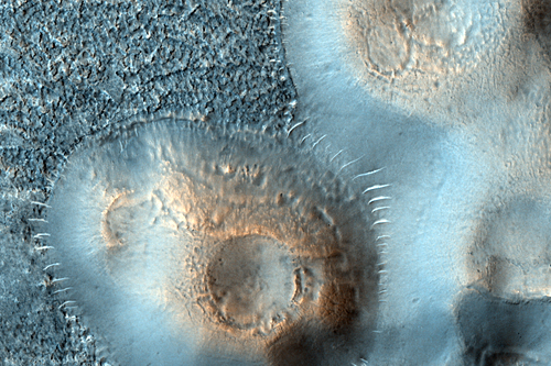 The Mud Volcanoes shown here, located in the Southern Acidalia Planitia, range in size between 20 and 500 meters in diameter. Credit: NASA/JPL/University of Arizona