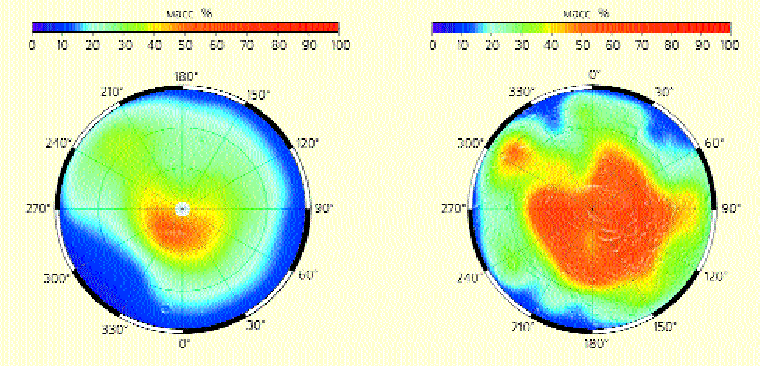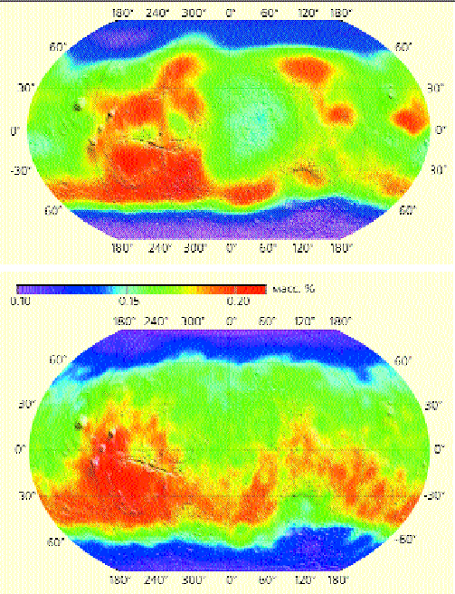 ....Было показано, что сухой грунт на поверхности имеет плотность около 16—35 г/см2. Среднее содержание водяного льда в нижнем слое выше широты 70°ю.ш. практически не меняется и составляет более 40 масс. На широте около 60°ю.ш. содержание водяного льда составляет 20 масс.%. Получается, что доля водяного льда в грунте вечной мерзлоты на севере и юге примерно одинакова. Различие состоит в том, что на юге лед не выходит на поверхность, а покрыт относительно тонким слоем сухого грунта. Можно предположить, что в настоящее время на Марсе происходит глобальное изменение климата, при котором водные ресурсы планеты перераспределяются с юга на север.