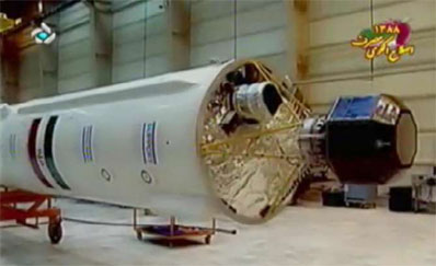 Iranian satellite is mounted on nose of Safir-2 launcher for integration tests before transport to launch pad. Satellite shown here is different from Mesbah being launched soon. Credit: ITAA