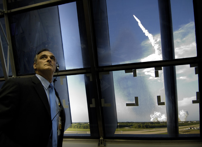 From inside the Firing Room at Kennedy Space Center in Florida, NASA Associate Administrator Rex Geveden monitors the on-time liftoff of Space Shuttle Atlantis on mission STS-117. Photo Credit: NASA/Bill Ingalls