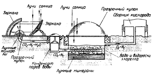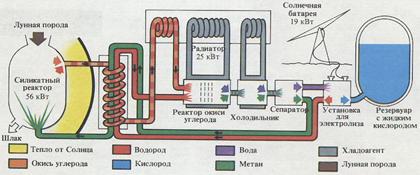 Кислород - наиболее распространенный элемент лунной породы. Ученые проводили исследования методов его выделения в жидком состоянии как компонента топлива для ракет многоразового использования. На рисунке показана схема химического завода на Луне. Лунная порода загружается в силикатный реактор, туда же подается метан, и печь разогревается теплом сфокусированных солнечных лучей. В результате реакции образуются окись углерода и водород. Эти газы охлаждаются в радиаторе и поступают в другой реактор, где окись углерода реагирует с циркулирующим водородом с образованием метана и водяного пара. Эти продукты через холодильник поступают в сепаратор, который отделяет метан и возвращает его в силикатный реактор. Вода конденсируется и направляется в установку для электролиза, работающую на солнечной энергии. Полученный кислород хранится в жидком состоянии, а водород используется в технологическом цикле. В состав шлака будут входить кремний и окиси ценных металлов.