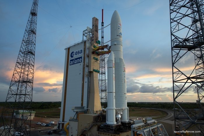The Ariane 5's final countdown will commence at 1422 GMT (10:22 a.m. EDT), with clocks at the Guiana Space Center timed for a targeted liftoff at 0145 GMT (9:45 p.m. EDT; 10:45 p.m. French Guiana time).
