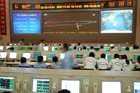 Experts work at the Beijing Aerospace Control Center (BACC) in Beijing, capital of China, Nov. 2, 2007. China moon exploration team successfully made the first orbital correction to the probe Friday morning to ensure that it travels on the projected orbit.