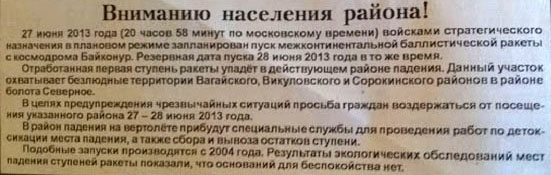 Как оказалось, несколько районных СМИ действительно выпустили объявление, в котором говорится о причинах взрыва. В нем сообщается, что 27 июня примерно в 21-00 по Москве произойдет пуск межконтинентальной баллистической ракеты с космодрома Байконур. Спрашиваете, какое отношение к этому имеет Тюменская область? Очень прямое! Дело в том, что точкой падения отработанной первой ступени ракеты наметили где-то посредине между Вагайским, Викуловским и  Сорокинским районами. Места там малолюдные, болота вокруг, сбрасывай детали от ракетоносителя – не хочу, называется. Позднее в район падения обещали выслать специальные службы для проведения работ по детоксикации и сбора и вывоза остатков ступени. Также сообщается, что по результатам экологических обследований оснований для беспокойства нет.