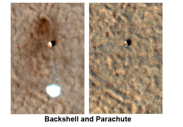 Two images of the Phoenix Mars lander taken from Martian orbit in 2008 and 2010. The 2008 lander image (left) shows two relatively blue spots on either side corresponding to the spacecraft's clean circular solar panels. In the 2010 (right) image scientists see a dark shadow that could be the lander body and eastern solar panel, but no shadow from the western solar panel. Image Credit: NASA/JPL-Caltech/University of Arizona