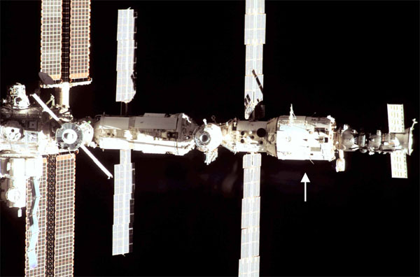 Внешний вид МКС. Стрелкой показано место установки приборов для эксперимента «Обстановка»