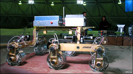 Начались испытания шасси для марсохода Exomars. На фото представлен вариант шасси от канадской фирмой MDA, известной своими разработками манипуляторов для МКС. Существует также европейский вариант шасси от немецкой фирмы "Эрликон",  окончательный выбор будет сделан к концу года (к совету министров ЕКА в ноябре-декабре). Ожидается, что в финальном варианте Exomars  будет иметь массу ~200 кг (у MER'ов - 185, у MSL - 800 кг) , нести до 10-20 кг научной аппаратуры и небольшой бур для исследования образцов на глубине до 2 м.