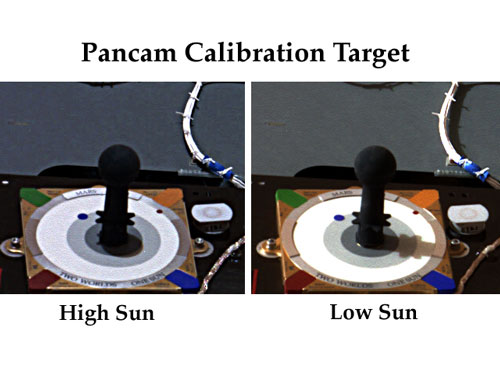 Итак, почему на обработаных фотографиях может легко получиться голубое как на Земле небо. Рассуждения о том как воспринимают цвет глаз и фотокамера считаю правильными но есть еще один ньюанс. На обоих марсоходах есть калибровочная световая таблица, которую они время от времени фотографируют вместе с пейзажами через ряд светофильтров. Я так понимаю что перед запуском эта таблица была сфотографирована в земных условиях теми же камерами и теми же фильтрами (не знаю фотографировали в лабораторных условиях или на улице, но вполне возможно что и на улице).