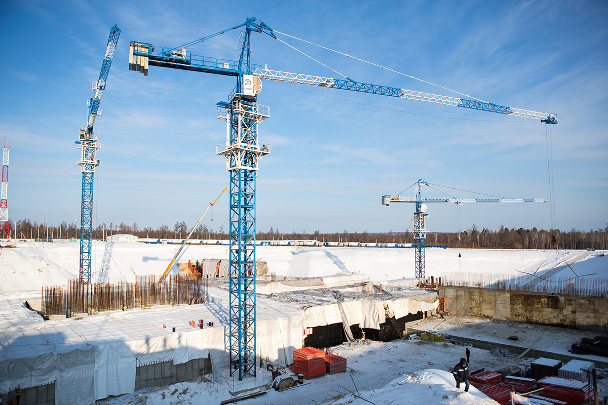 Даже с наступлением сорокоградусных морозов не останавливаются объемно-планировочные работы в части кладки стен и перегородок из ячеисто-бетонных блоков, монтаж металлоконструкций монтажно-испытательного корпуса ракеты-носителя ракеты космического назначения «Союз-2».