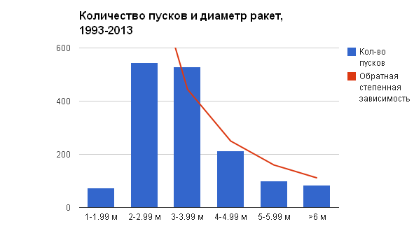 С точки зрения геометрии, максимальный объем при минимальной площади достигается для сферы. И аэродинамическое сопротивление и полная поверхность цилиндра пропорциональны квадрату радиуса, поэтому ракеты должны были бы быть достаточно невысокими и широкими. Однако, в реальности, ракеты очень тонкие и высокие. Дело в том, что увеличение диаметра увеличивает сложность изготовления и транспортировки ступени. У меня была гипотеза, что мера сложности работы со ступенью обратно пропорциональна квадрату радиуса. Я собрал данные о пусках ракет за последние двадцать лет (много пусков даст статистическую базу, а не очень большой временной диапазон не приведет к ошибке из-за изменения технологий) и построил график количества пусков в зависимости от наибольшего диаметра ступени (самого широкого бака). Что интересно, гипотеза подтвердилась: