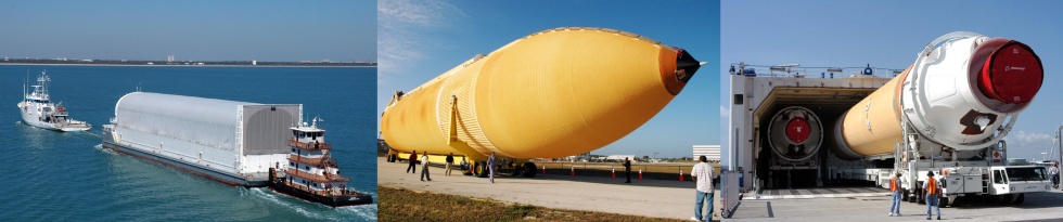 Слева баржа для транспортировки внешнего топливного бака «Спейс-Шаттла», по центру перевозка от причала в здание вертикальной сборки, справа транспорт «Дельта Маринер» перевозит ступени РН «Дельта-IV» и «Атлас- V»