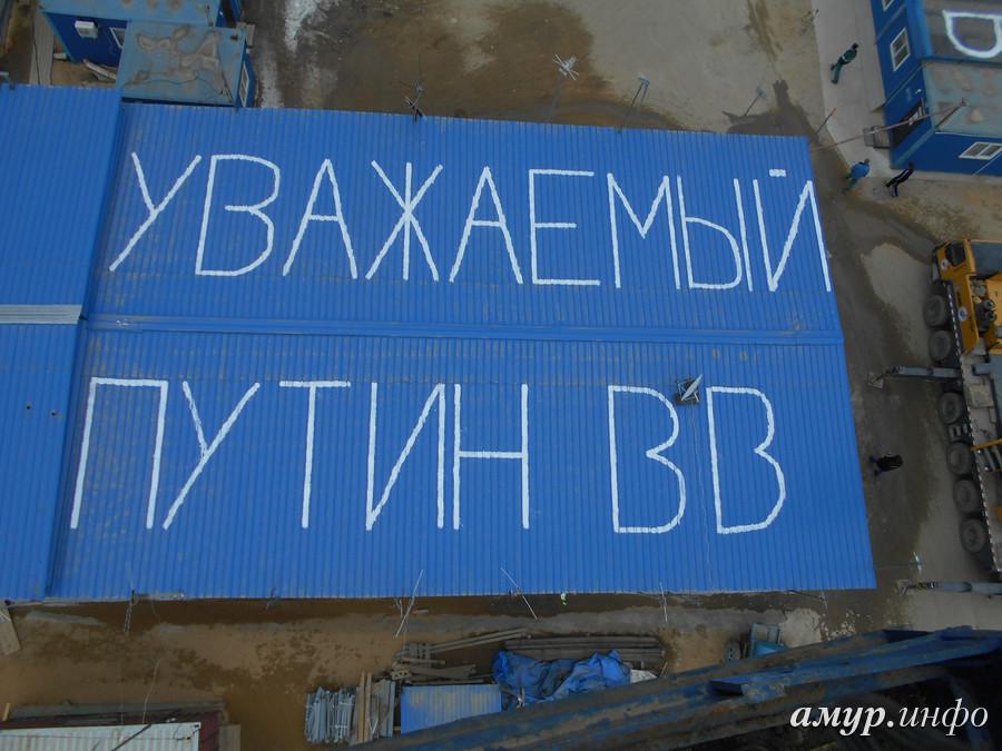 Несколько дней назад работники одной из компаний на космодроме Восточный выбрали более оригинальный способ связи с первым лицом государства. Послание президенту они написали прямо на крышах своих времянок. Так же своё обращение к президенту записали работники Шимановского депо.
