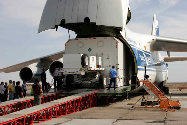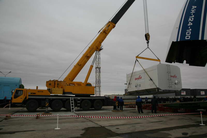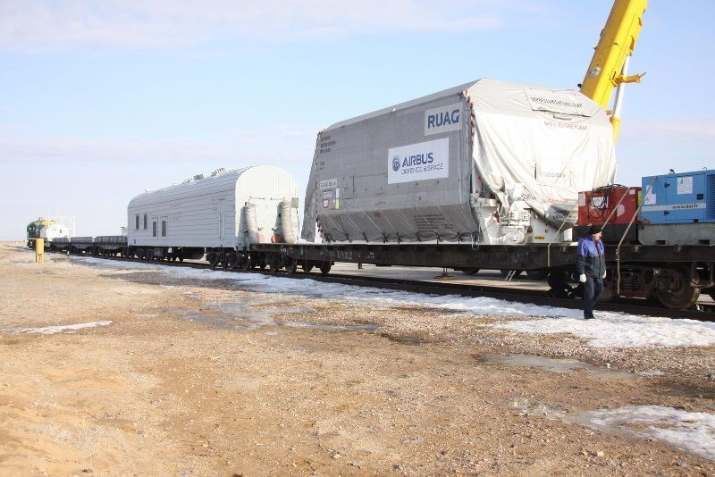 Грузовой самолет подъезжает к железной дороге, на который стоит поезд, и сразу с грузового отсека самолета контейнер с КА перегружается на него. Сразу к контейнеру подключается вагон термостатирования.