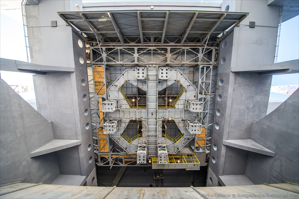 И вот в конце пути она - мобильная башня обслуживания космодрома высотой с 15-этажный дом, а за ней стартовая площадка.