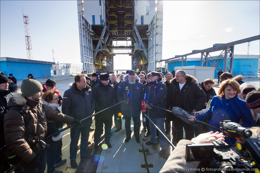 3 часа пережидать задержку, чтобы снять для нескольких человек ФНК закрытые двери башни журналистам было скучно  :) . Все нужные остальному народу фотки и ролики были сняты, с незакрытыми дверями башня на СК вообще смотрится интересней, кусочек РН опять же виден, чего там перед ней торчать? Можно погреться и прийти после, чтобы снимать уже Комарова на фоне РН с расчехлёным ГО (ГО без чехла косвенно подтверждает последующий штатный "докат" башни).