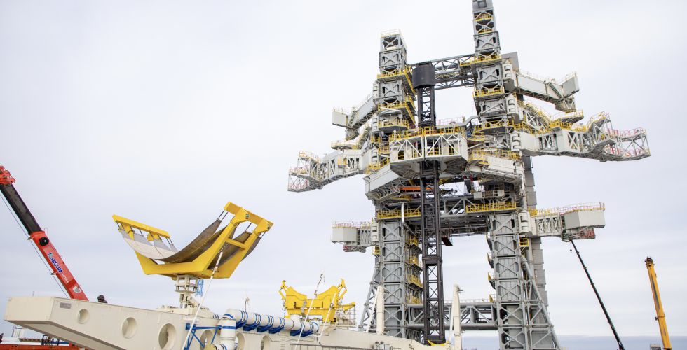 Грузомакет, имитирующий ракету-носитель «Ангара», с помощью транспортно-установочного агрегата перевели в вертикальное положение, после чего установили в стартовое сооружение.