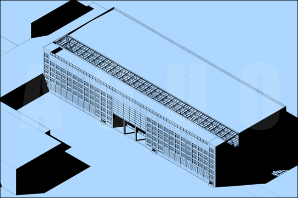 При компоновке здания, необходимо было правильно связать между собой группы вентиляционных установок, пультовых и административно-бытовых помещений. Основной проблемой было расположение вентиляционных камер, обслуживающих монтажный зал ракеты-носителя. Для вентиляционных установок, с учетом всех необходимых технологических проходов и изгибов воздуховодов требовались помещения глубиной 24м. Пристраивать вентиляционные камеры с противоположной стороны от административно-производственного блока было бы неэкономично, т.к., соответственно, на те же 24 метра пришлось бы увеличивать длину трансбордерной галереи, на 48м длину охранного периметра площадки, на тысячи метров площадь местных проездов и т.д. Кроме этого, расположение пристроенных объемов с двух длинных сторон монтажного зала не позволило бы обеспечить в нем требуемый уровень естественной освещенности. Таким образом, было принято решение разместить вентиляционные камеры на 1-2 этажах административно-производственного блока. Чтобы минимизировать количество "темных" помещений и коридоров (длина корпуса 180 метров), все полезные площади на 3-6 этажах выстроены по внешней освещенной грани 24-метровых блоков вентиляционных камер, а весь оставшийся объем здания оставлен "пустым". Получившийся таким образом атриум позволил, кроме прочего, осветить помещения пультовых на 2-м и 3-м этажах через проемы в перекрытиях. В центре атриума помещен остекленный эллипсоид конференц-зала.