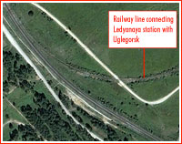 Просто посмотрите на Яндекс карте, там обозначена жд дорога и станция Углегорск. На спутнике Углегорск лучше чем на Гугле, виден мост новой трассы через жд. ветку, прямо вдоль дороги Ледяная-Углегорск Станция на 3 пути, далее 1 ветка направо к электростанции и подземным резервуарам с топливом, вторая прямо и направо уходит видимо на тех позиции, за предел мелкого масштаба. Даже в NRO не надо обращаться :twisted: