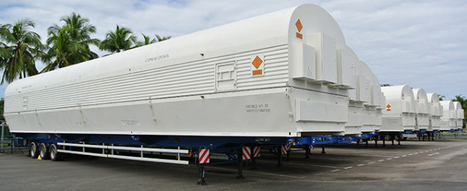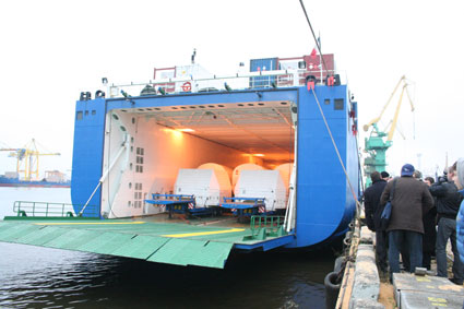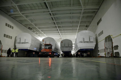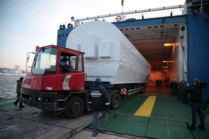 И перевозить корпуса и баки наверно лучше действительно как французы придумали - в амортизированном и  термоизолированном контейнере, где груз будет надежно защищен и зафиксирован. Контейнер целиком в корабль завозить через ворота в корме или краном через открывающийся верхний люк в трюм.
