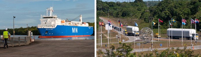 The MN Colibri completes another trans-Atlantic voyage (left photo), arriving at Pariacabo Port with elements for three Soyuz launchers. At right, a convoy enters the Spaceport with some of the Soyuz components unloaded from the MN Colibri.