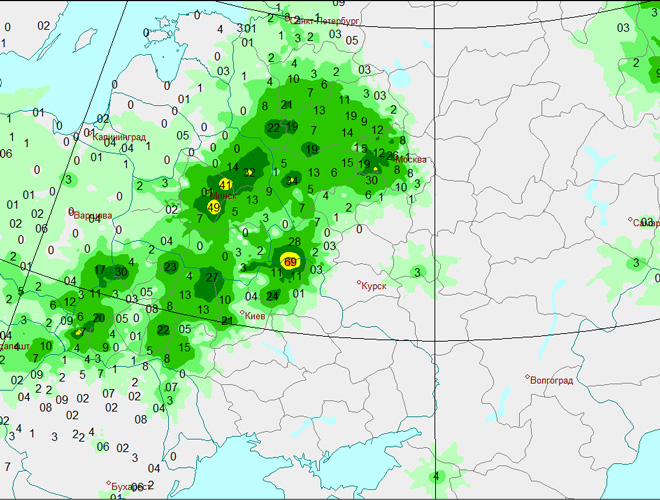 Наиболее интенсивные грозовые дожди прошли на западе Подмосковья. В Немчиновке выпало 37 мм осадков. Града и шквалов не отмечалось. Восточные районы Подмосковья атмосферный фронт обошел стороной.
