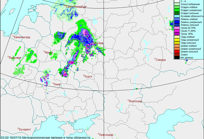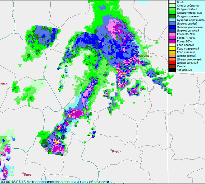 Радар 03:00 по Гринвичу 18 июля 2016 г. © Гисметео