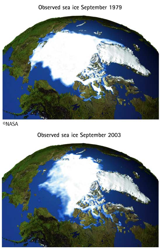 These two images, constructed from satellite data, compare arctic sea ice concentrations in September of 1979 and 2003. September is the month in which sea ice is at its yearly minimum and 1979 marks the first year that data of this kind became available in meaningful form. The lowest concentration of sea ice on record was in September 2002.