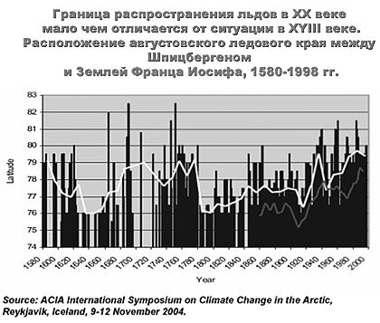 «Нетрудно видеть, — пишет Андрей Илларионов, — что граница распространения ледового покрова в Арктике в последнее десятилетие принципиально не отличается от значений 1580-х гг., 1720-80-х, 1940-х гг.»