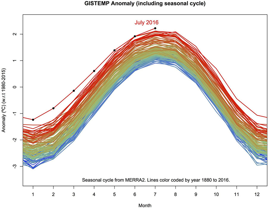 Специалисты НАСА утверждают, что тенденция продолжается, кроме того, июль 2016 стал десятым подряд месяцем, которые бьет температурные рекорды. Гэвин Шмидт (Gavin Schmidt) добавил, что 2016 должен стать самым теплым годом в истории.