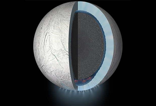 Например, как полагают ученые, на Энцеладе под слоем льда на глубине 30–40 километров располагается океан, в недрах которого имеются термальные источники, нагревающие воду до температуры 90 градусов Цельсия. Вероятно, спутник Сатурна сформировался на ранних этапах развития Солнечной системы, а его каменное ядро по своим свойствам похоже на примитивные метеориты (углеродистые хондриты), достигающие поверхности Земли. Последние содержат, в частности, минералы серпентин и сапонит, которые обеспечивают Энцелад водородом и теплом, необходимыми для существования хемоавтотрофных форм жизни. На Земле такие организмы представлены бактериями, которые получают энергию и органику из химических реакций окисления неорганических соединений.