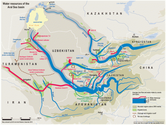 В Таджикистане и Киргизии берут начало главные реки региона — Сырдарья и Амударья. Кроме того, страны богаты водой в горных ледниках. От подачи воды из этих стран зависят аграрные Казахстан, Узбекистан и Туркмения, которые, кроме рек, соединены с двумя странами множеством искусственных каналов. Противоречие всегда состояло в том, что Таджикистан и Киргизия накапливают воду в водохранилищах и готовы масштабно сбрасывать ее в регион зимой, когда их гидроэлектростанции вырабатывают электроэнергию для отопления. Другим странам она нужна летом, чтобы орошать поля. В системе СССР баланс установила Москва. Вода поступала равномерно в течение года, а дефицит электроэнергии в Таджикистане и Киргизии погашался за счет поставок топлива и электроэнергии из Туркмении, Узбекистана и Казахстана.