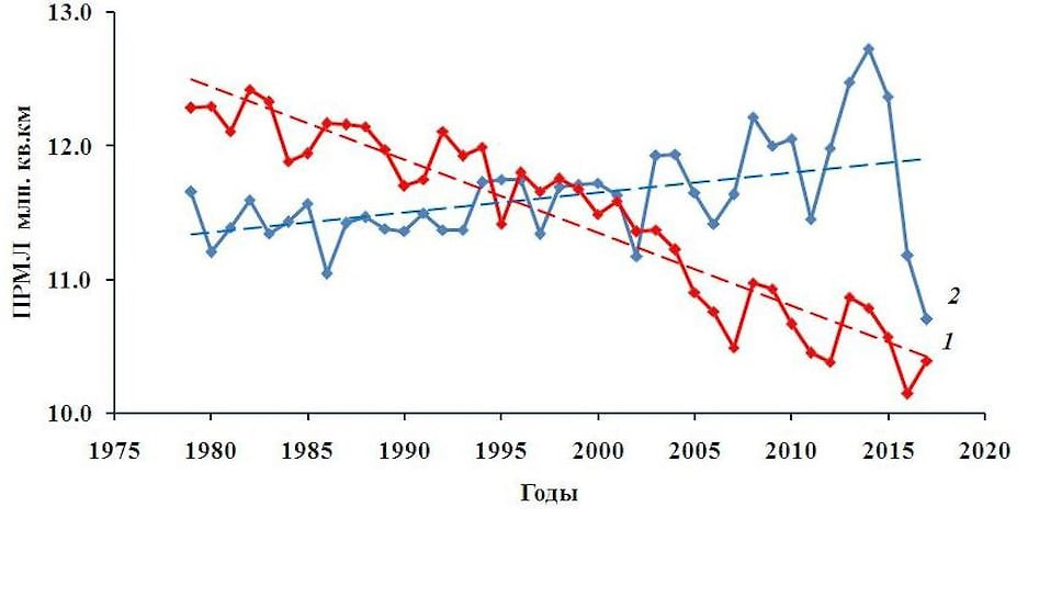 А теперь давайте посмотрим на рисунок, на котором представлен  межгодовой ход годовых значений площади морского льда для северной (1) и  южной (2) полярных областей за период 1979–2017 годов. Мы видим, что  наблюдается стремительное сокращение площади морского льда в северной  полярной области. Абсолютный минимум отмечался в 2016 году, когда  площадь морского льда составляла 10,2 на 106 кв. км.