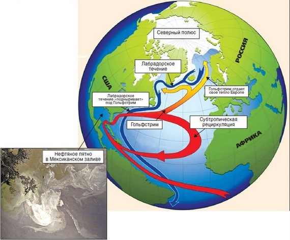 Первым об остановке Гольф­стрима в августе 2010 г. сообщил доктор Зангари, физик-теоретик Института из Фраскати (Италия). Он несколько лет сотрудничает с группой ученых, ведущих мониторинг Мексиканского залива. По его словам, «...огромное количество нефти, постоянно расширяясь в объеме, охватывает такие огромные области, что оказывает серьезное воздействие на всю систему терморегуляции планеты путем разрушения граничных слоев теплого потока воды. Конвейер в Мексиканском заливе прекратил свое существование месяц назад, последние спутниковые данные ясно показывают, что Северо-Атлантического течения в настоящее время нет, и Гольфстрим начинает разбиваться на части в 250 км от берега Северной Каролины. Ситуация, когда теплые воды текут через более прохладные, оказывает большой эффект не только на океан, но и на верхние слои атмосферы высотой до семи миль. Отсутствие этого обычного явления в восточной части Северной Атлантики нарушило нормальный ход атмосферных потоков летом этого года. В результате образовались неслыханно высокие температуры в Москве (до 40оС), засухи и наводнения в Центральной Европе и массовые наводнения в Китае, Пакистане и других странах Азии».