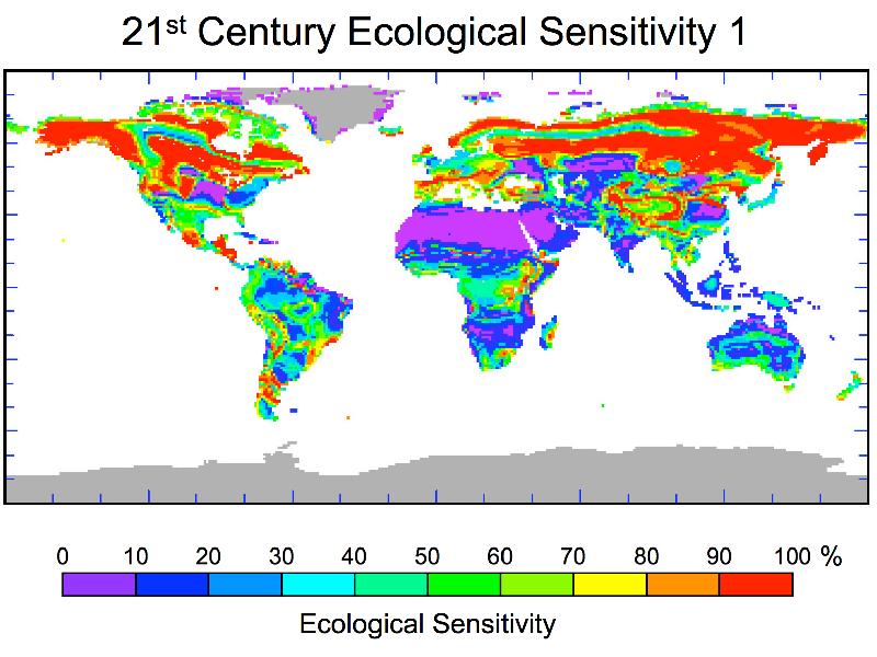 The model projections paint a portrait of increasing ecological change and stress in Earth's biosphere, with many plant and animal species facing increasing competition for survival, as well as significant species turnover, as some species invade areas occupied by other species. Most of Earth's land that is not covered by ice or desert is projected to undergo at least a 30 percent change in plant cover - changes that will require humans and animals to adapt and often relocate.