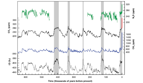 Figure TS.1. Variations of deuterium (δD) in antarctic ice, which is a proxy for local temperature, and the atmospheric concentrations of the greenhouse gases carbon dioxide (CO2), methane (CH4), and nitrous oxide (N2O) in air trapped within the ice cores and from recent atmospheric measurements.
