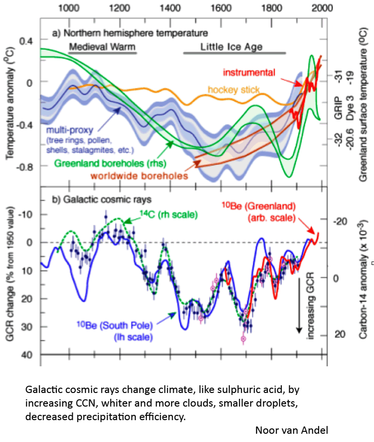 ЦитироватьWhen the IPPC says it is "very likely" (90% probability according to their published definitions) that human activity has caused most global warming, what is the remaining 10% probability of something else causing global warming? Actually the hesitation by the IPCC to say excess global warming is 100% due to human activity is because of the unknowns associated with clouds and cosmic rays. It is a quite well known fact that the sun's high internal activity causes increased solar wind, which decreases cosmic rays because of more particle collisions in outer space, which reduces cloud formation, which increases the sun's rays which get through to the earth, which then heats up our earthly temperatures. So how do cosmic rays create clouds?